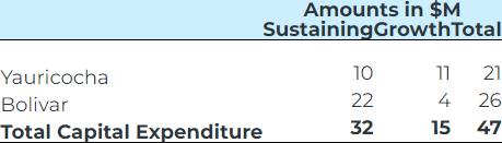 Growth capital for 2023, projected at $15.0 million, includes costs of tailings dam expansion ($5.6 million) and Yauricocha shaft ($3.2 million) in Peru. Growth capital at Bolivar includes costs of the tailings dam and the starter dam.