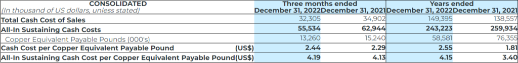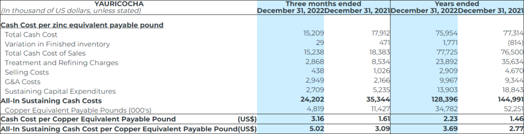 The following table provides detailed information on Yauricocha’s cash cost, and all-in sustaining cost per copper equivalent payable pound for the three months and years ended December 31, 2022 and 2021: