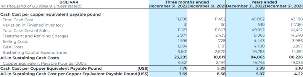 The following table provides detailed information on Bolivar’s cash cost, and all-in sustaining cost per copper equivalent payable pound for the three months and years ended December 31, 2022 and 2021: