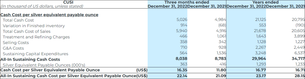 The following table provides detailed information on Cusi’s cash cost, and all-in sustaining cost per silver equivalent payable ounce for the three months and years ended December 31, 2022 and 2021: