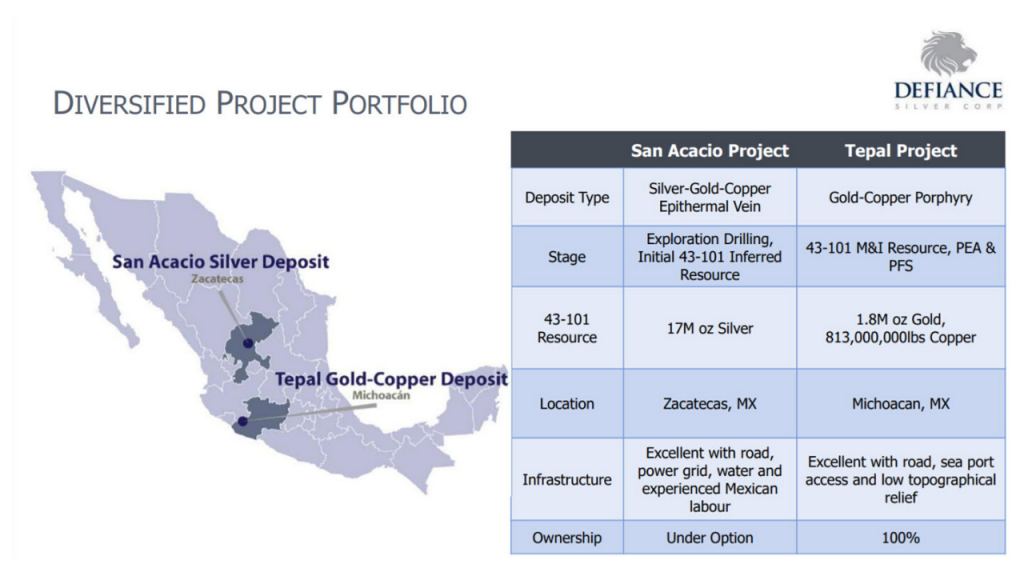Defiance Silver Corp. (DEF | TSX Venture Exchange; DNCVF | OTC; D4E | Frankfurt) is an exploration company advancing the district-scale San Acacio Deposit, located in the historic Zacatecas Silver District and the 100% owned Tepal Gold/Copper Project in Michoacán state, Mexico. Defiance is managed by a team of proven mine developers with a track record of exploring, advancing and developing several operating mines and advanced resource projects Defiance’s corporate mandate is to expand the San Acacio and Tepal projects to become premier Mexican silver and gold deposits.