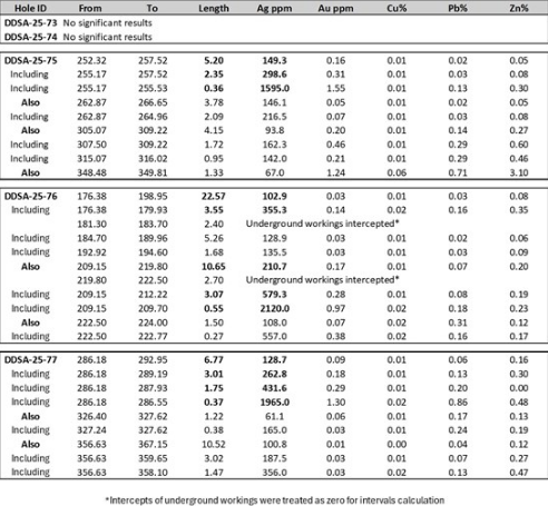 • DDSA-25-76 – returned 3.55m of 355.32 g/t Ag (from 176.38m to 179.93m) within a 22.57m interval grading 102.91 Ag/t from (179.93m to 198.95m). This hole also returned 3.07m of 579.27 g/t Ag (from 209.15m to 212.22m) including 0.55m of 2120 g/t Ag (from 209.15m) within a wider interval returning 10.65m grading 210.70 g/t Ag from (209.15m to 219.80m).