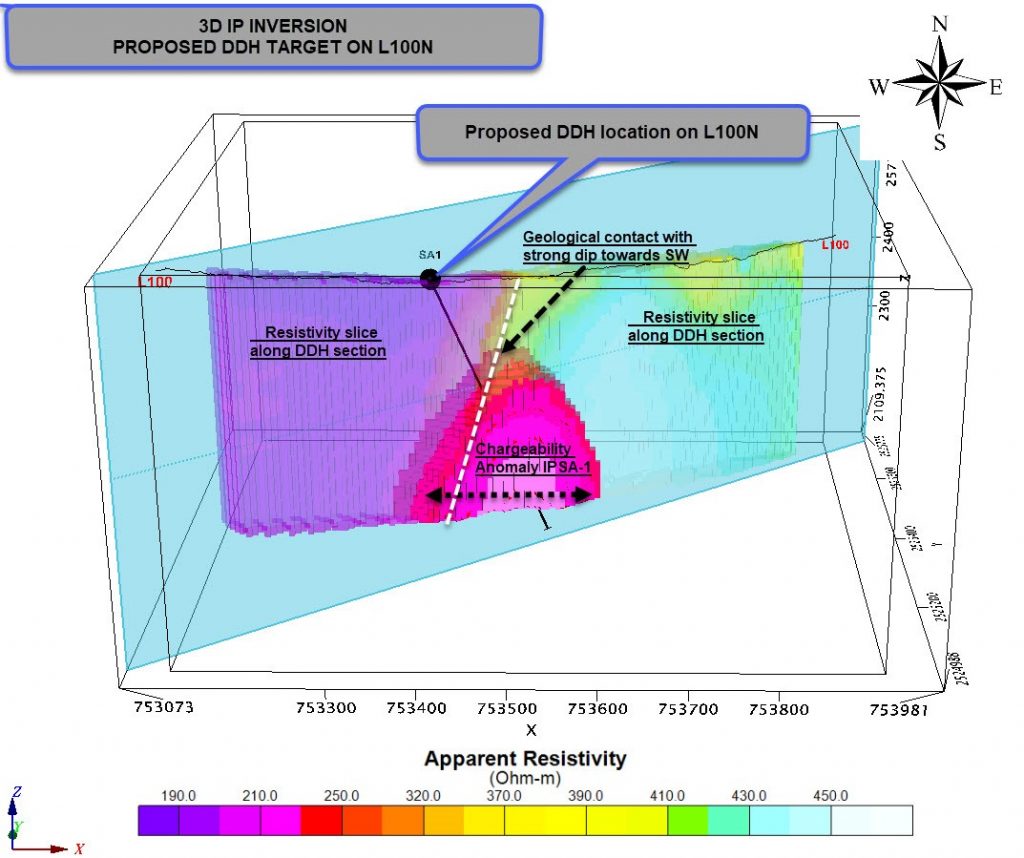 Figure 1 3D IP Inversion, proposed drill target on L100N