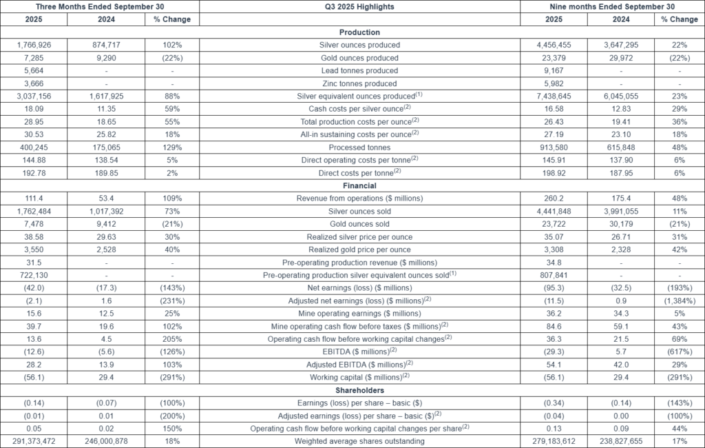 In Q3 2025, the Company’s mine operating earnings were $15.6 million (Q3 2024 – $12.5 million) from revenue of $142.8 million (Q3 2024 – $53.4 million) and cost of sales of $127.2 million (Q3 2024 – $41.0 million). The improvement in mine operating earnings is due to higher operating earnings at Bolañitos and Guanaceví driven by higher realized metal prices, as well as the additional contribution of $3.9 million in operating earnings from Kolpa. These earnings are offset by Terronera’s operating loss of $3.6 million during the commissioning period. The increase in cost of sales compared to the prior period was driven by an additional $35.1 million from Kolpa, and $35.1 million from Terronera.
