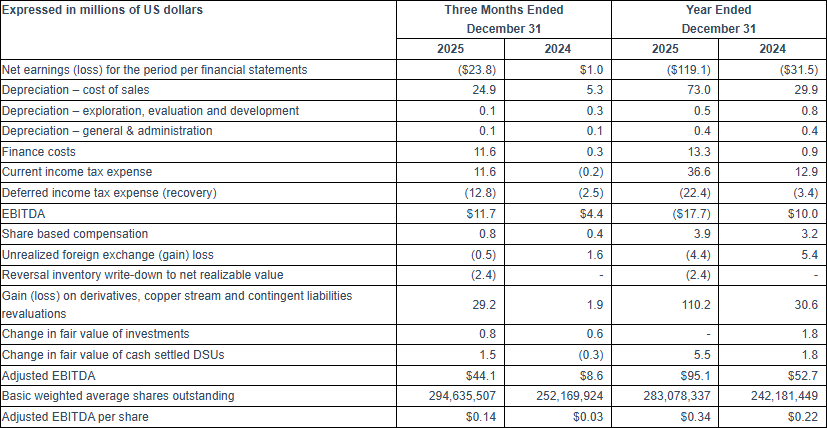 The loss before taxes for Q4 2025 was $25.0 million (Q4 2024 – loss of $1.6 million) after finance costs of $11.9 million (Q4 2024 – $0.4 million), a foreign exchange loss of $0.1 million (Q4 2024 – foreign exchange gain of $0.4 million), net losses on derivative contracts of $45.2 million (Q4 2024 – $1.9 million). These losses on derivative contracts incurred during the quarter were primarily derived from the loss on revaluation of the gold forward swap contracts of $25.4 million (Q4 2024 – $0.5 million gain) and silver collar contracts of $17.0 million (Q4 2024 – $ nil), as well as a $9.8 million loss on a revaluation of the copper stream liability (Q4 2024 – $ nil), partially offset by a $0.6 million gain on Mexican peso forward contracts (Q4 2024 – loss of $2.4 million) and a $6.2 million gain on the compound derivative in the convertible note. Also contributing to the loss before taxes were investment and other losses of $2.5 million (Q4 2024 – investment and other income of $0.7 million). The Company realized a net loss for the period of $23.8 million (Q4 2024 – net earnings of $1.0 million) after recognizing an income tax recovery of $1.2 million (Q4 2024 – income tax recovery of $2.7 million).