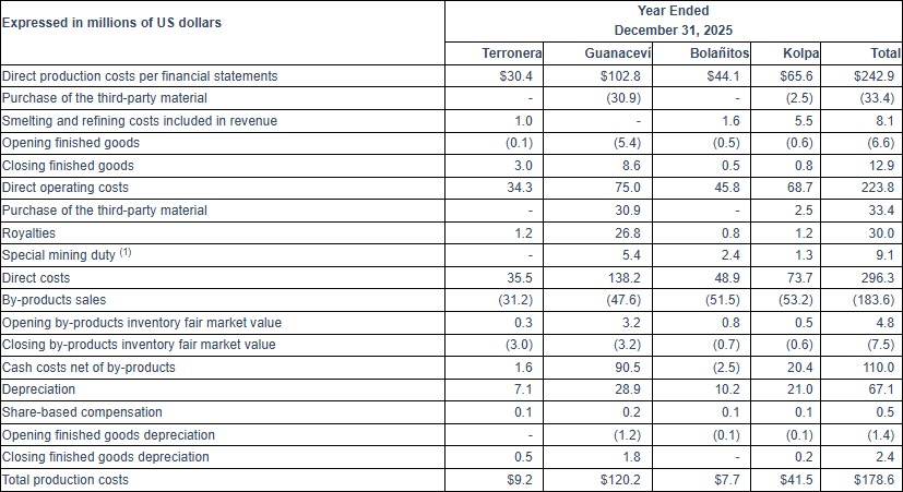 1) inclusive of 212,691 oz of silver from pre-operating production at Terronera during three months ended December 31, 2025 and 240,321 oz during the Year ended December 31, 2025