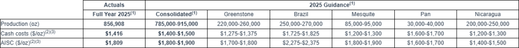 - Achieved a Full Year production record of 922,827 ounces; including 856,908 ounces meeting 2025 guidance of 785,000 to 915,000 ounces, plus 65,918 ounces from Valentine, Los Filos and Castle Mountain(2)
