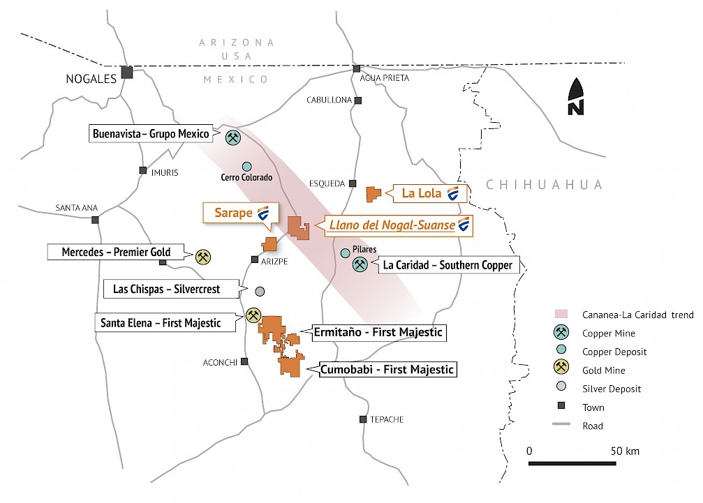 The Llano del Nogal project is located approximately 180 kilometres northeast of Hermosillo and covers roughly 115 square kilometres of ground including the recent addition of the Suanse property.  The project lies in the Cananea-La Caridad trend where it intersects an east-northeast-striking structural trend that hosts epithermal gold-silver vein and breccia systems (Figure 1).  The properties overlie an area of extensive alteration developed in pre-mineral Cretaceous volcanic rocks and Laramide-age intrusions (Figure 2).