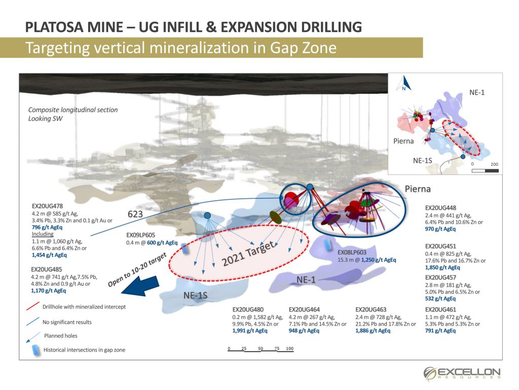 Drilling from underground continues to define and expand known mineralization ahead of production at the Pierna, NE-1 and NE-1S Mantos. Most significantly, drilling into the Gap Zone (see Figure 1), a zone of vertical mineralization inadequately tested with vertical holes drilled from surface, provides a significant opportunity to add additional mineralization along a target approximately 300 metres along strike with a vertical extent of 30-40 metres. This target will be a priority for the 2021 program and remains open to the south of the deposit, where drilling from surface at the 10-20 target has intersected mineralization beyond the current extent of the Platosa mineral footprint.