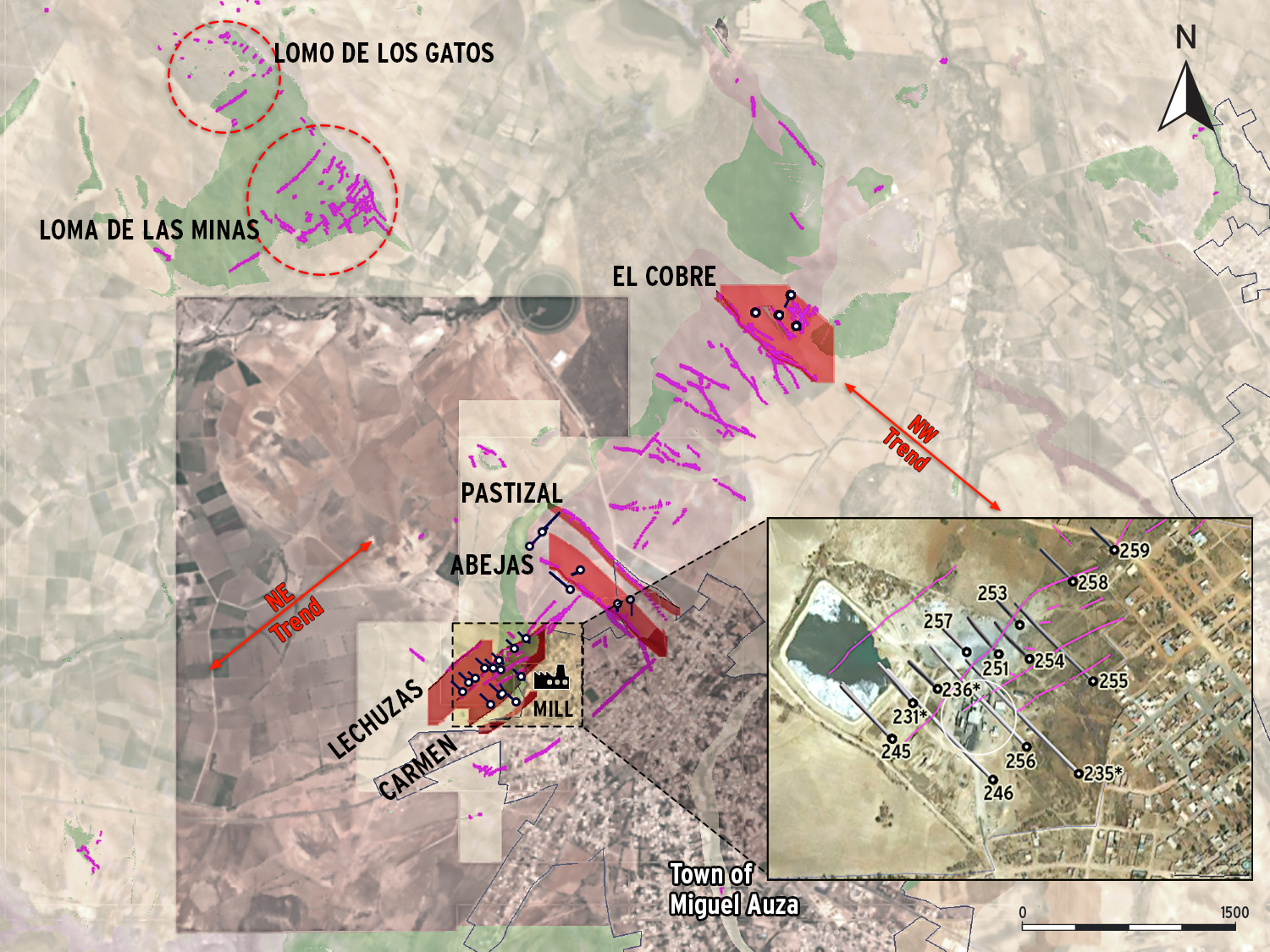 - Broad intersections of continuous silver, lead and zinc mineralization with anomalous gold intersected on the Lechuzas vein, with an open strike of 600 metres and open below 500 metres with high grade zones, including:
