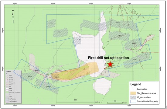 A total of 11 first priority IP targets have been delineated property wide (see Figure 1 below), which are in a generalized east – west direction. Anomaly IPSM-1 located 400 meters to the east of the last surface expression of the Santa Maria Veins is defined as sub-cropping, (very shallow) and an extension of the Santa Maria veining. All other IP anomalies define new trends in the northern sector and range from shallow in depth to deep seated, +/- 100-150 meters in depth. The deeper anomalies are described as wide bodies in the areas where they intersect the secondary mineralized north – south veining. The geological team has collected 26 surface samples over all anomalies, and these have been submitted to ALS Chihuahua Laboratory for analysis.