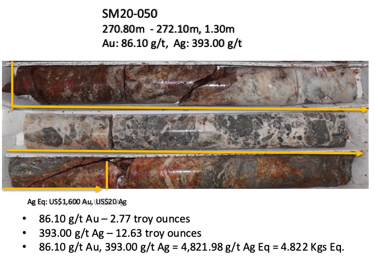 Previously reported holes SM20-47, 48 and 49 all intercepted this new hydrothermal breccia. In this case the hanging wall of the breccia intercepted by hole SM20-50 reported 321.39 g/t Ag Eq with 0.51 g/t Au over 1.25 meters.