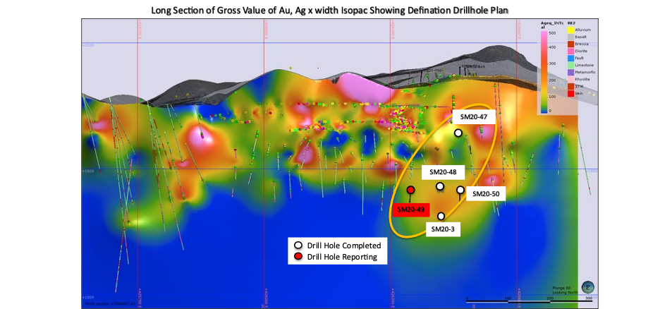 Peter J. Hawley, CEO and President, remarks, “As you can see below, planned definition hole SM20-49 was designed to fill in a drill poor gap in the past resource area and to follow the down dip mineralized plunge intercepted in drill holes SM20-47 and 48. Previously reported hole SM20-47 reported a broad zone of 13.10 meters grading 98.31 g/t Ag Eq with numerous higher-grade intercepts within, while hole SM20-48 returned 110.81 g/t Ag Eq over 24.50 meters. See Figure 1 below.