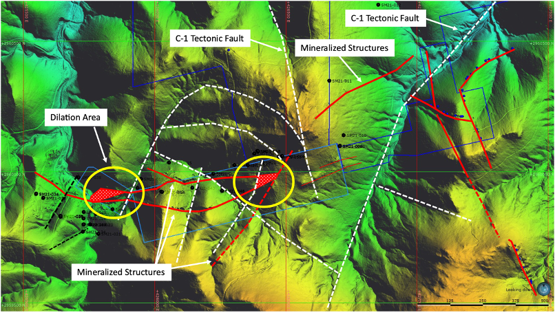 The eastern dilation zone is defined in part by hole SM20-50 which reported 21.90 meters grading 349.21 g/t Ag Eq with 5.29 g/t Au, including 11.05 meters reporting 664.57 g/t Ag Eq with 10.35 g/t Au and 1.30 meters grading 4,821.98 g/t Ag containing 86.10 g/t Au. See Figure 5 below for drill hole targets and dilation zone locations.