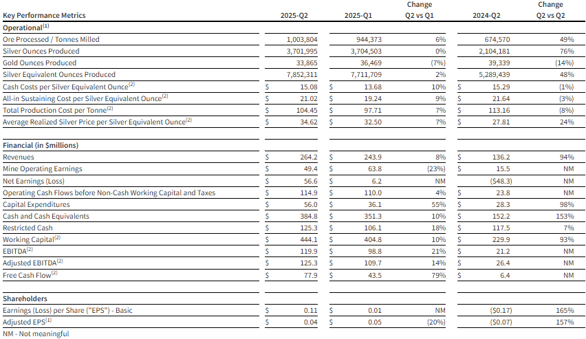- Robust Silver Equivalent Production (+48% Y/Y): The Company produced 7.9 million silver equivalent (“AgEq”) ounces, including 3.7 million silver ounces, in Q2 2025 representing a 48% increase compared to 5.3 million silver equivalent ounces produced in Q2 2024.
