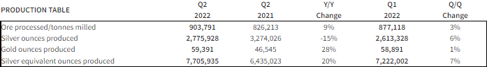 - Total Production Increased by 20% Y/Y: The Company produced 7.7 million AgEq ounces representing a 20% increase when compared to the second quarter of 2021 primarily due to the acquisition of Jerritt Canyon and successful ramp up of the Ermitaño mine at Santa Elena.