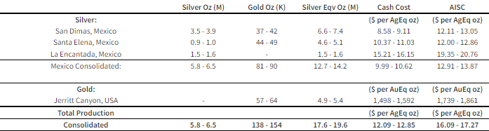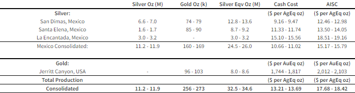 A mine-by-mine breakdown of the revised full year 2022 production guidance is included in the table below and assumes the prices for calculating AgEq ounces are the same as previously stated above.