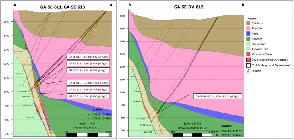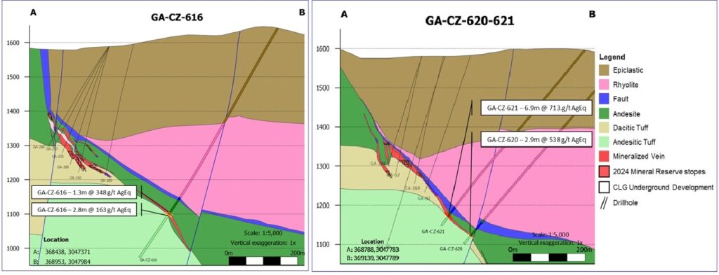 At Los Gatos, silver, zinc, lead, gold and copper drill hole intercepts were composited using the length weighted averages of uncapped sample assays, a 140 g/t AgEq minimum grade, and a minimum composite length of 0.7 m (true width). A maximum one metre below the minimum grade was allowed as internal dilution and a single sample below the minimum AgEq grade was allowed in the hanging or footwall to achieve minimum true width in select cases. True width of intercepts is calculated based on current understanding of drill hole and vein angle geometry. All individual samples or intercepts higher than 500 g/t AgEq are reported as “include”.