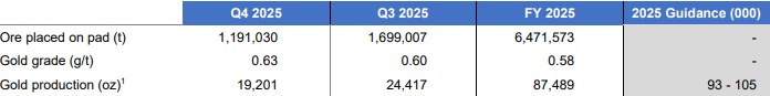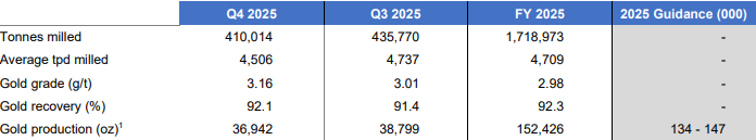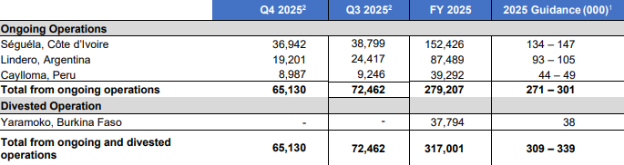 Séguéla produced a record total of 152,426 ounces of gold in 2025, 4% above the upper end of annual guidance.