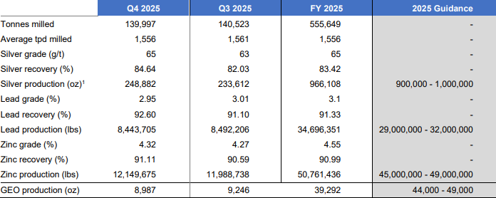 Caylloma produced a total of 966,108 ounces of silver, 50.8 million pounds of zinc, and 34.7 million pounds of lead or 39,292 GEO in 2025.