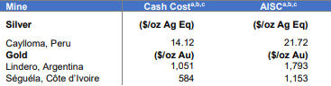 - Historical non-IFRS measure cost comparatives: The following table provides historical cash costs and historical AISC for the Caylloma, Lindero and Séguéla mines for the year ended December 31, 2024, as set below: