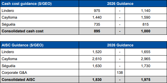 Consolidated AISC is expected to be between $1,830 and $1,975 per ounce, representing a slight increase compared to 2025. This increase is primarily attributable to higher royalties of approximately $30 per ounce, assuming a gold price of $3,750 for 2026, and the impact of relative metal prices at Caylloma, estimated at $60 per ounce on a gold equivalent basis. In addition, AISC reflects a higher cost base at Séguéla, as the prior year benefited from the processing of ore inventory with lower unit mining costs. These factors are partially offset by lower cash costs at Lindero and higher gold production at Séguéla.