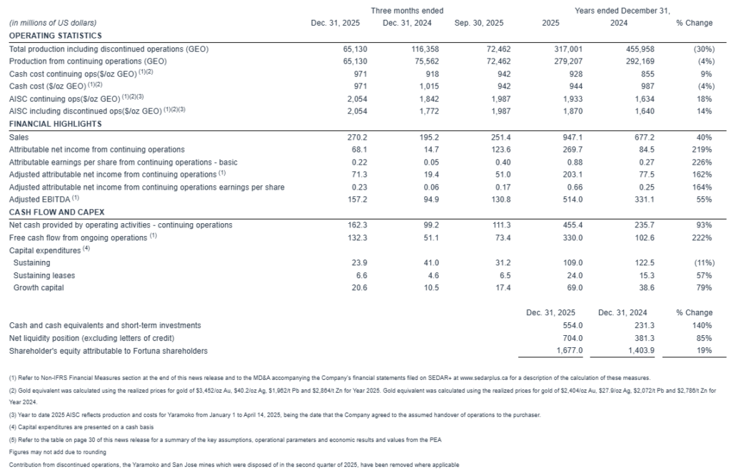 Jorge A. Ganoza President and CEO of Fortuna, commented, “Q4 was a strong end to the year as we delivered record free cash flow from operations of $132.3 million and returned $12.1 million to our shareholders.” Mr. Ganoza continued “We finished the year in line with production guidance but at a higher AISC due to the impact of rising metal prices on royalties, gold equivalent ratios and share based compensation expenses. Adjusting for these items our AISC would have been under $1,700 an ounce.” Mr. Ganoza concluded “2025 was a transition year for Fortuna as we streamlined our portfolio by divesting non-core assets and positioned the Company for its next phase of growth at Diamba Sud and the Séguéla plant expansion. All this is underpinned by one of the best balance sheets in our peer group with $704 million in liquidity and $381 million in net cash.”