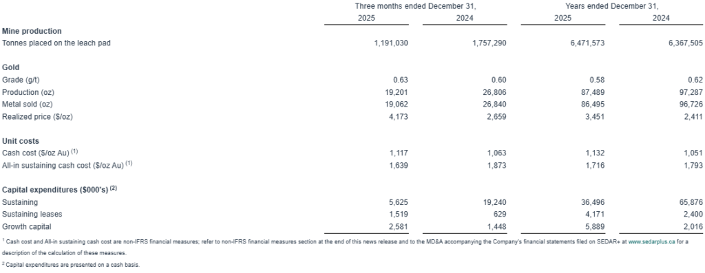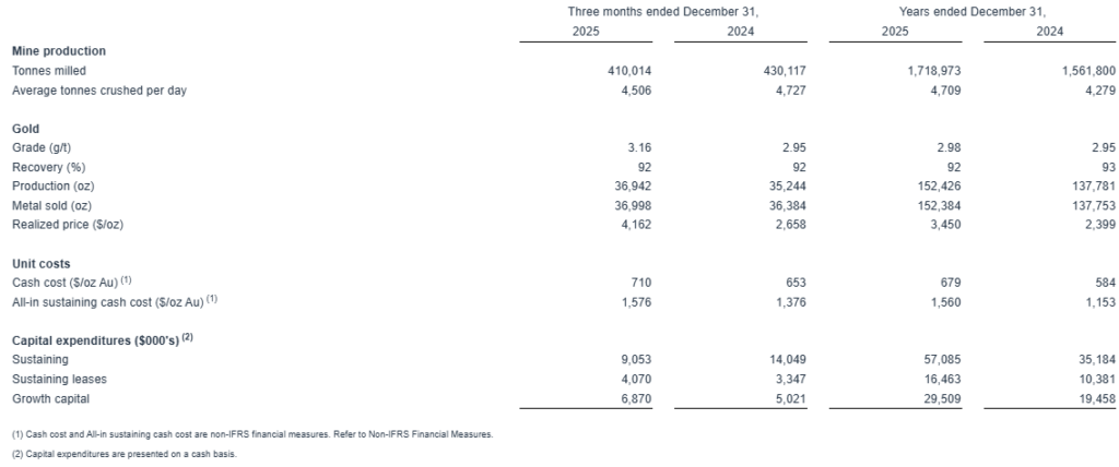 Gold production in 2025 totaled 152,426 ounces, above the upper end of the annual guidance range. An 11% increase in ounces of gold produced during the year was mainly due to the realization of throughput optimization projects through 2024 increasing ore processed, and a 19-day loss of time in 2024 as a result of power shedding from the national grid supplier.