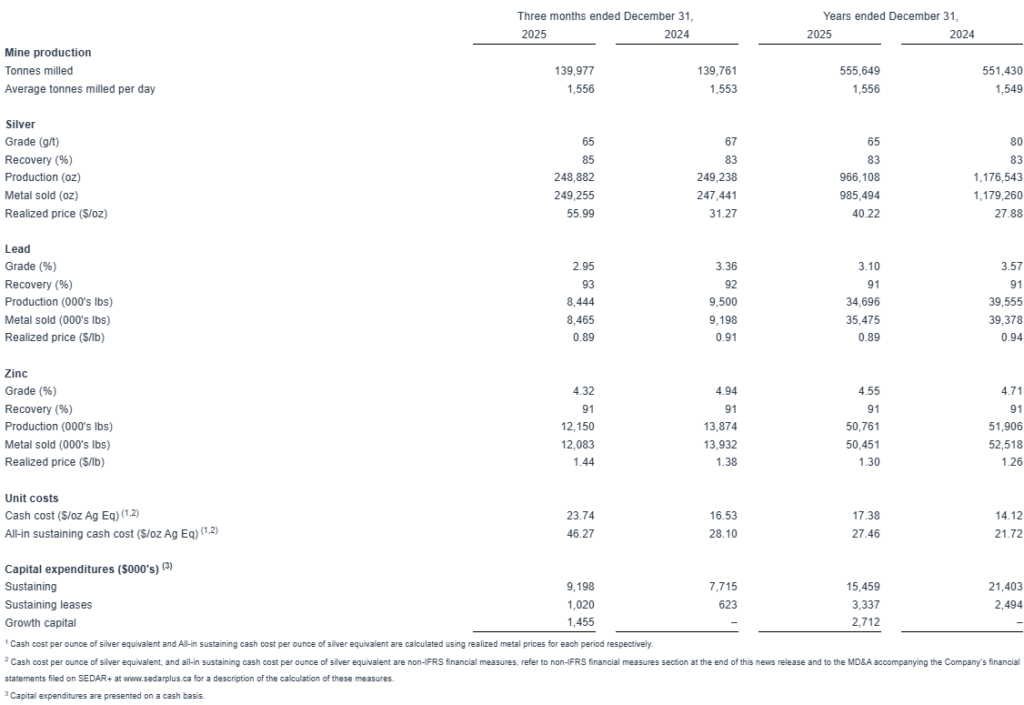 In the fourth quarter of 2025, the Caylloma Mine produced 248,882 ounces of silver at an average head grade of 65 g/t, comparable to the same period of 2024.