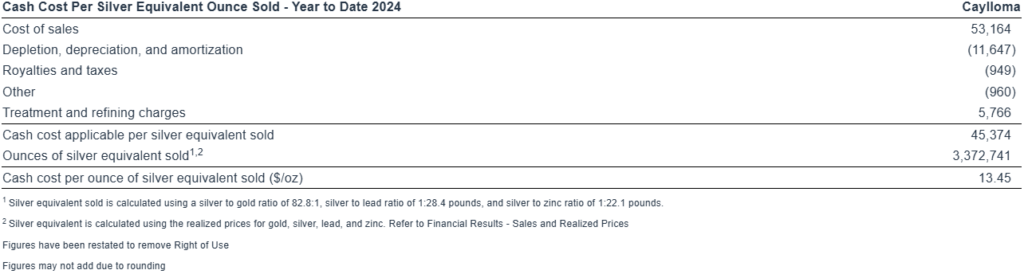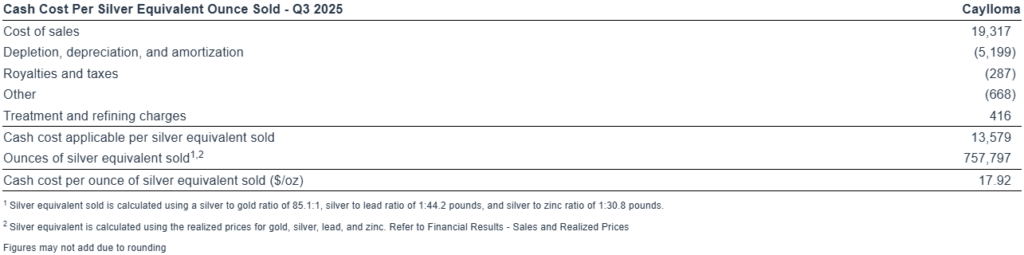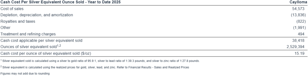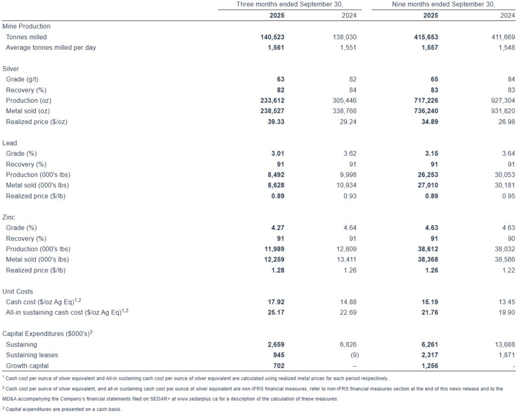 The cash cost per silver equivalent ounce sold in the third quarter of 2025 was $17.92 compared to $14.88 in the same period in 2024. The higher cost per ounce for the quarter was primarily the result of lower silver production and the impact of higher realized silver prices on the calculation of silver equivalent ounce sold.