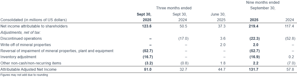 Attributable net income from continuing operations for the period was $123.6 million, or $0.40 per share, compared to $35.5 million, or $0.11 per share, in Q3 2024. After adjusting for reversals of impairments and stockpile write-downs of $69.4 million at Lindero and other non-recurring items, adjusted attributable net income was $51.0 million or $0.17 per share compared to $32.7 million or $0.10 per share in Q3 2024. The increase was primarily due to higher realized gold prices, which averaged $3,467 per ounce in Q3 2025 compared to $2,498 per ounce in Q3 2024 and higher sales volumes at Séguéla driven by higher processes ore and grades. This was partially offset by higher stock-based compensation and a $7.4 million foreign exchange loss (see discussion above) compared to a $1.1 million gain in Q3 2024.
