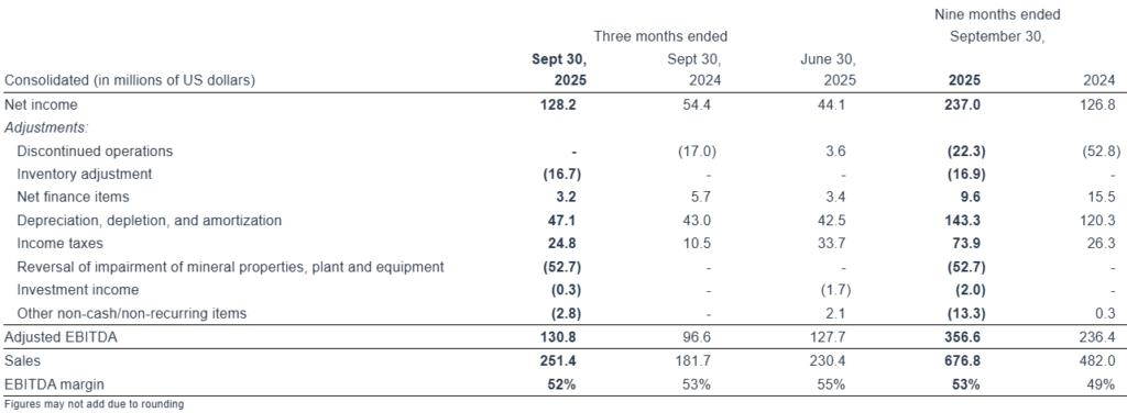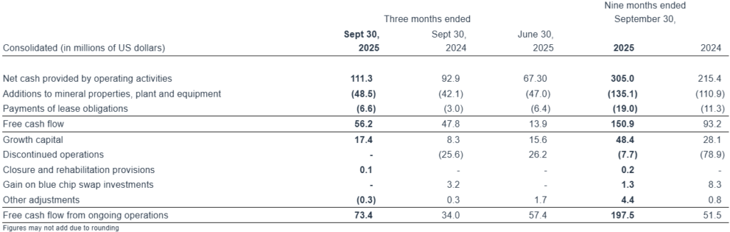 Free cash flow from ongoing operations in Q3 2025 was $73.4 million, compared to $30.4 million reported in Q3 2024. The increase was mainly due to higher prices and metal sold as discussed above. Sustaining capital expenditures for the quarter were $31.2 million, mostly consistent with Q3 2024.