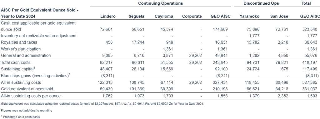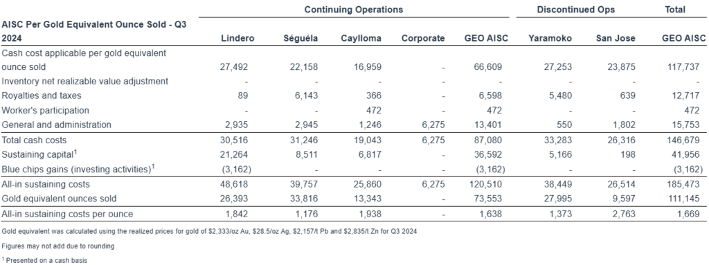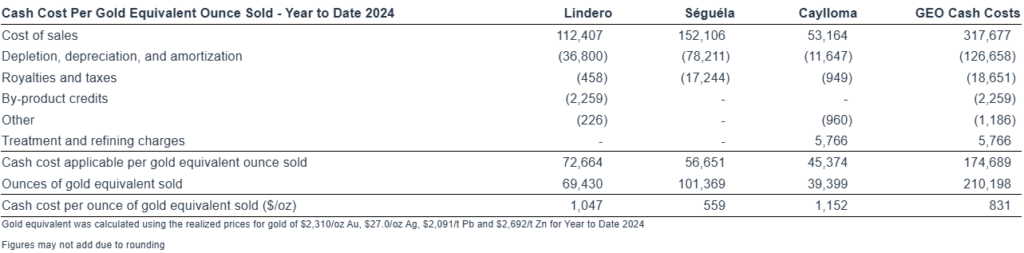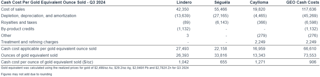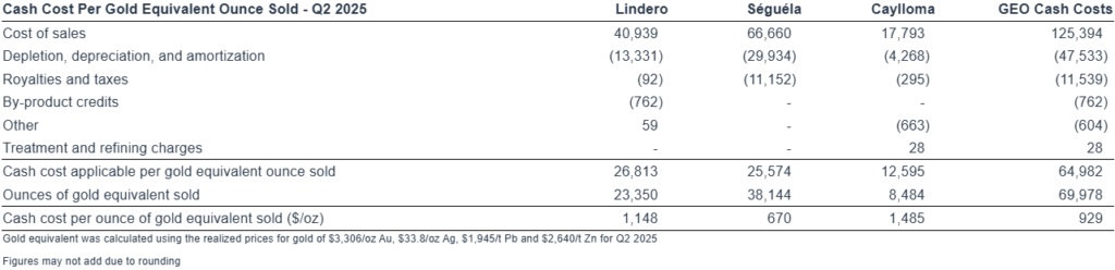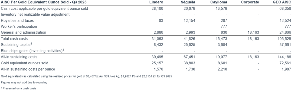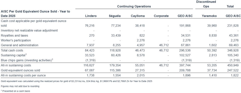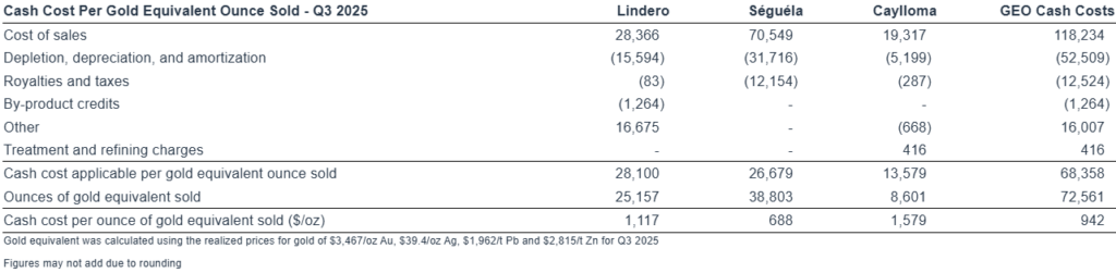 Consolidated cash cost per GEO increased to $942 in Q3 2025, representing a $36 increase compared the $906 recorded in Q3 2024. This increase was mainly due to higher mine stripping ratios at Séguéla and Lindero, as per the mine plan, and lower gold equivalent ounces at Caylloma due to an increase in the gold price and the impact on gold equivalent ounces.