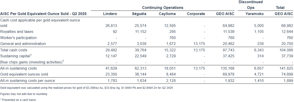 • Consolidated AISC per GEO1 from continuing operations of $1,987 compared to $1,932 in Q2 2025. AISC includes a one-time impact of $80 related to a higher SBC expense