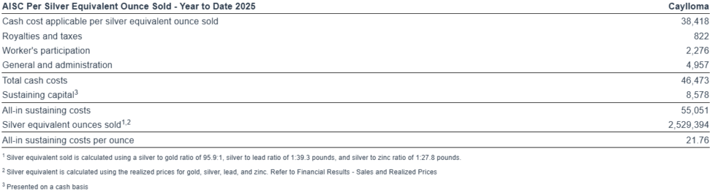 In the third quarter of 2025, the Caylloma Mine produced 233,612 ounces of silver at an average head grade of 63 g/t, a 24% decrease when compared to the same period in 2024.