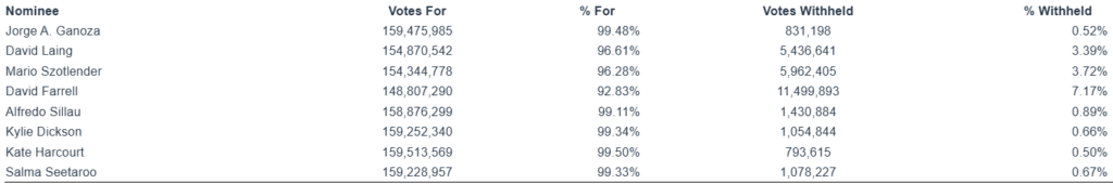 A total of 188,888,907 common shares were represented at the meeting, accounting for 61.54% of Fortuna’s issued and outstanding shares as of the record date. Shareholders voted in favor of all matters of business, including the appointment of auditors and the election of all director nominees listed in the Company’s Management Information Circular dated May 1, 2025.
