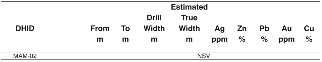 | DHID | From | To | Drill Width | Estimated True Width | Ag | Zn | Pb | Au | Cu | |