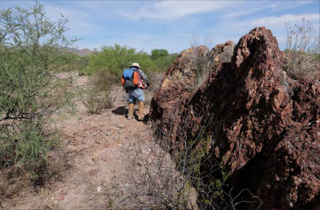 The Pedro epithermal gold system was discovered by Bearing Resources Ltd. in 2012 during a regional program exploring for silver and is defined at surface by a combined gold (>20 ppb) and arsenic (>100 ppm) soil anomaly with dimensions of 4000 metres by 1000 metres. Outcrop exposure comprises prominent hematite-stained silica-rich ridges of angular chalcedony fragments and silicified sedimentary rocks within an angular course breccia. The host rock to these breccias is mostly Ahuichila Formation conglomerate. The mineralization extends beneath post-mineral volcanic rocks, colluvium (range front fanglomerate) and alluvium to the north and east. Rock sampling of the exposed zones returned values in rock from background levels to a maximum of 2.3 gpt (197 samples with 53 greater than 0.25 gpt and 9 greater than 1 gpt). Samples were collected by previous operators, primarily Bearing Lithium and Newmont de Mexico in 2012 and 2013.