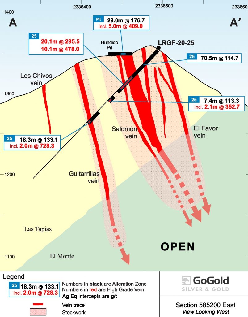 Hole LRGF-20-025 intersected significant mineralization for a total of 96.2m out of 124.3m drilled from surface, including 70.5m of 115 g/t AgEq, 18.3m of 133 g/t AgEq, and 7.4m of 113 g/t AgEq. The hole also included multiple higher grade intersections included within the wider intervals, including 10.1m of 478 g/t AgEq, 2.1m of 353 g/t AgEq, and 2.0m of 728 g/t AgEq .