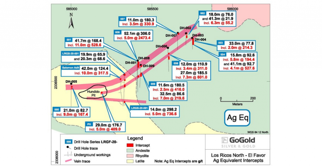HALIFAX, NS, Nov. 18, 2020 /PRNewswire/ – GoGold Resources Inc. (TSX: GGD) (OTCQX: GLGDF) (“GoGold”, “the Company”) is pleased to release additional assay results from the Company’s El Favor deposit on the Los Ricos North property, including 3.3m of 3,675 g/t silver equivalent (“AgEq”) from hole LRGF-20-008.