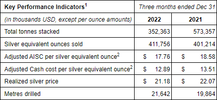 Additional GAAP measures that are presented on the face of the Company’s consolidated statements of comprehensive income include “Operating income (loss)”. These measures are intended to provide an indication of the Company’s mine and operating performance. Per ounce measures are calculated by dividing the relevant mining and processing costs and total costs by the tonnes of ore processed in the period. “Adjusted cash costs per ounce” and “Adjusted all-in sustaining costs per ounce” are used in this analysis and are non-GAAP terms typically used by mining companies to assess the level of gross margin available to the Company by subtracting these costs from the unit price realized during the period. These non-GAAP terms are also used to assess the ability of a mining company to generate cash flow from operations. There may be some variation in the method of computation of these metrics as determined by the Company compared with other mining companies. In this context, “Adjusted cash costs per ounce” reflects the cash operating costs allocated from in-process and dore inventory associated with ounces of silver and gold sold in the period. “Adjusted cash costs per ounce” may vary from one period to another due to operating efficiencies, grade of material processed and silver/gold recovery rates in the period. “Adjusted all-in sustaining costs per ounce” include total cash costs, exploration, corporate and administrative, share based compensation and sustaining capital costs. For a reconciliation of non-GAAP and GAAP measures, please refer to the Management Discussion and Analysis dated February 13, 2023 for the three months ended December 31, 2022, as presented on SEDAR.