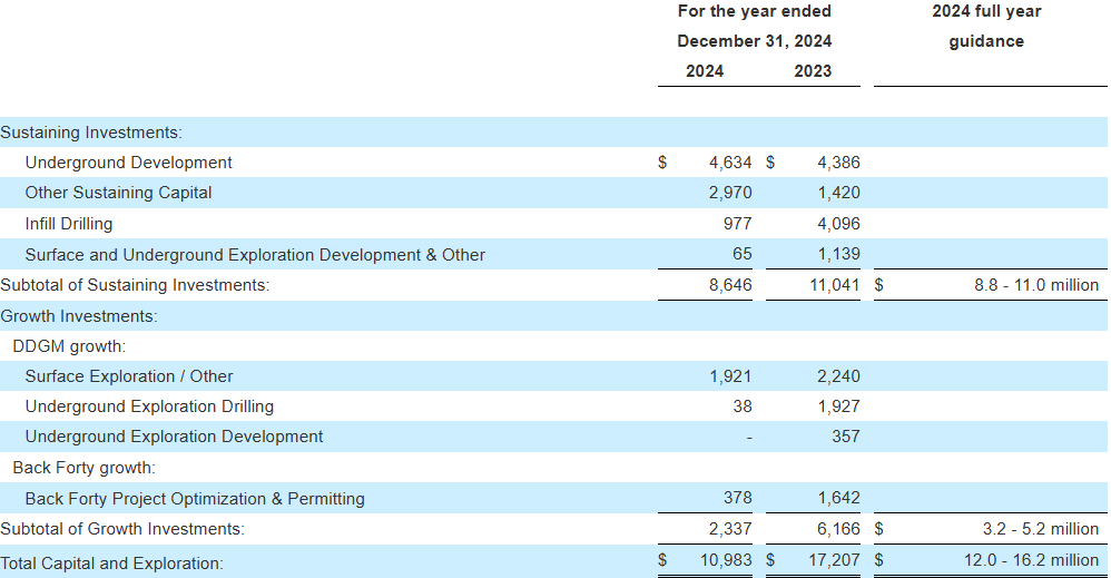 • The Company closed the year with a $1.6 million cash and cash equivalent balance as at December 31, 2024. The decrease of $4.6 million from December 31, 2023 is mainly attributable to a cash outflow of $6.4 million for capital investments and $0.6 million from operating activities for 2024, which included $1.1 million of income tax payments for the tax years 2023 and 2024, exploration investment of $2.0 million at DDGM, and $0.4 million in maintaining the Back Forty Project.