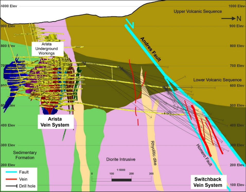 From an underground exploration drill station located approximately 200 meters to the northeast of the Arista Mine’s Arista vein system, eight (8) drill holes tested the northern strike and up-dip extensions of the Switchback vein system. Multiple en echelon veins were encountered, extending the known mineralization at Switchback both along strike and up-dip to higher elevations (see map).