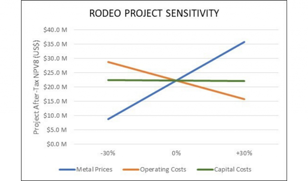 The strip ratio for the project is 1.7:1, and the processing plant’s daily throughput is estimated to be 480 tpd (based on a 350-day operating year). The excavation of the Rodeo resource will be completed in three push backs starting in the highest-grade material closest to the surface.
