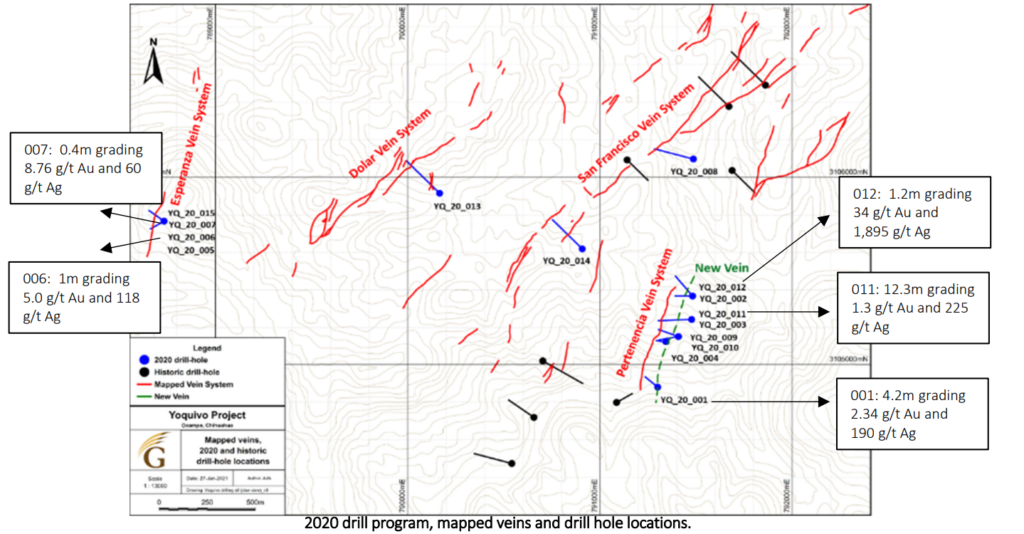 Hole YQ_021_006, which cut the highest grade interval to date, was drilled to explore the southern continuation of the mineralization intersected by hole YQ_20_001 (1.3m grading 5.69 g/t Au and 223 g/t Ag (link)), which was drilled to explore the down-dip continuation of the Pertenencia Vein below the historic mine workings.
