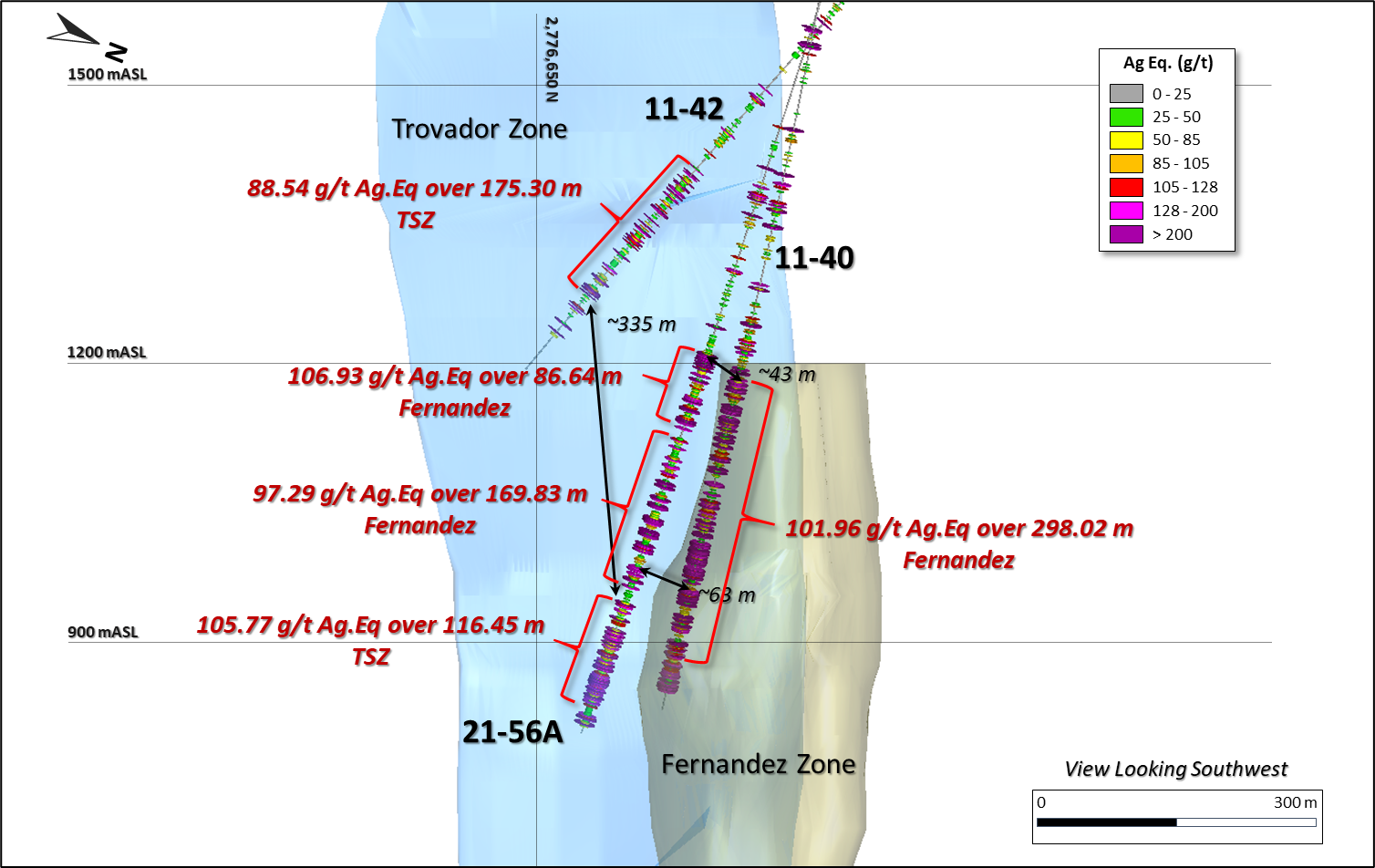 Hole 21-56A was drilled to the southeast over the top of the Fernandez Zone to test the gap between the Fernandez and Trovador Zone resource envelopes established in the 43-101 Technical Report Mineral Resource Estimate prepared by SGS Canada effective April 2013 (Figures 1 & 2). The hole also tested the TSZ mineralization as reported in the Company’s news release from February 17, 2021 in hole 11-42 (88.54 g/t Ag.Eq over 175.30 m) at approximately 335 m depth beneath the TSZ in hole 11-42 (700 vertical m from surface 1650 mL).