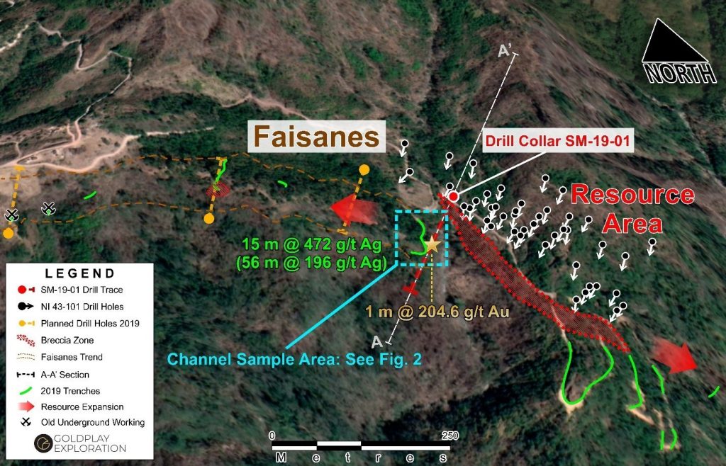 Surface exploration and channel sampling at Faisanes have revealed additional high-grade silver and gold anomalies (Figure 1). Channel sampling consisted of saw-cutting along the road walls and road surface near the SM-19-01 discovery drill hole (News Release dated 30 July, 2019), which returned a 1 m intercept of 204.6 g/t gold. The channel sampling was augmented by systematic geological and structural mapping along the road.