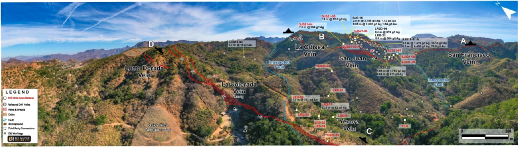 GR Silver Mining President and CEO, Marcio Fonseca commented “The Loma Dorada – La Colorada Vein System appears increasingly to be a swarm of sub-parallel NW-NNW trending Au and Ag mineralized veins. Results from the 2021 exploration program at the Loma Dorada target indicate that several of the vein structures have strong continuity, over a strike length that has increased to approximately 600 m and are still open to the south. In the La Colorada section of this vein system, where a small mine operation is currently ongoing in a third party-owned concession, the Company has received strong Au-Ag channel sample results located to the NW of the main mineralization, extending from the third-party concession into GR Silver Mining’s concessions, providing encouragement for drill hole results currently pending from this same area.