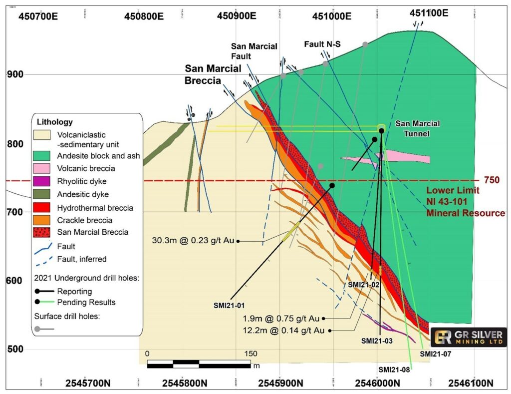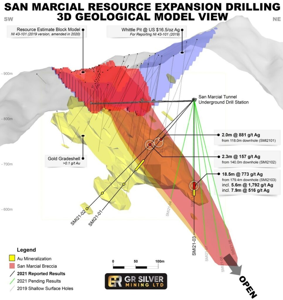 GR Silver Mining President and CEO, Marcio Fonseca commented “The first drill results from our resource expansion program at San Marcial have proven the consistency and continuity of the Ag-rich San Marcial Breccia mineralization, along strike and down dip. Based on such encouraging initial assay results we are anticipating continued positive results for the remainder of the drill core currently at the laboratory. The introduction of a modern exploration approach by the GR Silver Team is delineating an extensive hydrothermal system with presence of high-grade silver mineralization, proving continuity of the San Marcial Breccia down dip to support resource expansion. It is also delineating wide Au mineralized zones, which will be the subject of additional drilling in 2022. I congratulate the GR Silver Team for its exploration achievement at San Marcial by discovering the down dip extension of the San Marcial Breccia.”