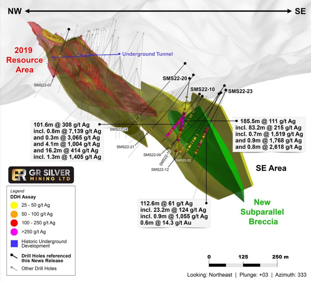 GR Silver Mining Chair and CEO, Eric Zaunscherb comments “As we close off the San Marcial database for the resource estimation scheduled this quarter, we are excited by the potential contribution of the new SE Area discovery. These most recent drill results contribute to our understanding of the mineralization at the SE Area as well as the original San Marcial Resource Area. San Marcial continues to deliver high-grade precious metal intervals within broad, well-mineralized masses. The discovery of high-grade Ag and Au mineralization outside, and to the SE, of the known structural corridor at the SE Area is highly encouraging. After delivery of the updated mineral resource, we will outline our strategic plan for 2023 and one can expect that the extension of exploration along this emerging and highly prospective SE trend will feature prominently.”